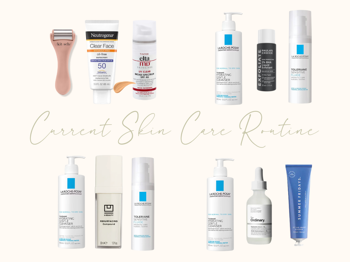 Morning: cleanse with water, ice roll/apply ice, gentle moisturizer (La Roche-Posay Toleriane Sensitive Fluide), sunscreen (Neutrogena Clear Skin 50 spf for everyday, or Elta MD Tinted Sunscreen if I want some coverage)